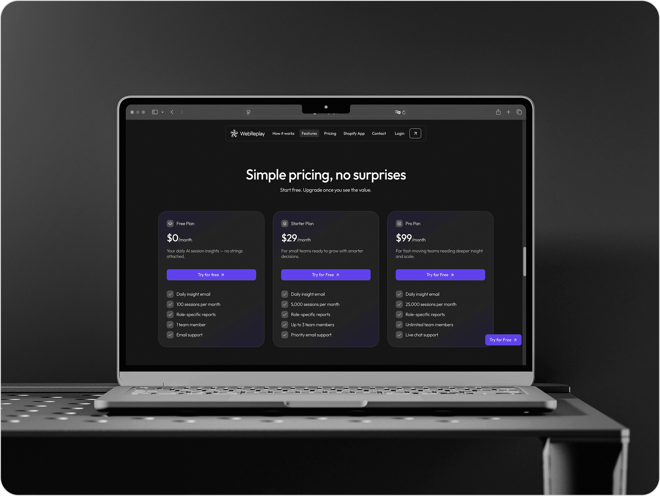 WebReplay's onboarding—installing a single line of code—is its main competitive advantage. We designed the site to highlight that message at various stages of the user journey, using clear calls to action, short sections, and a flow that reduces friction and encourages users to try the tool.