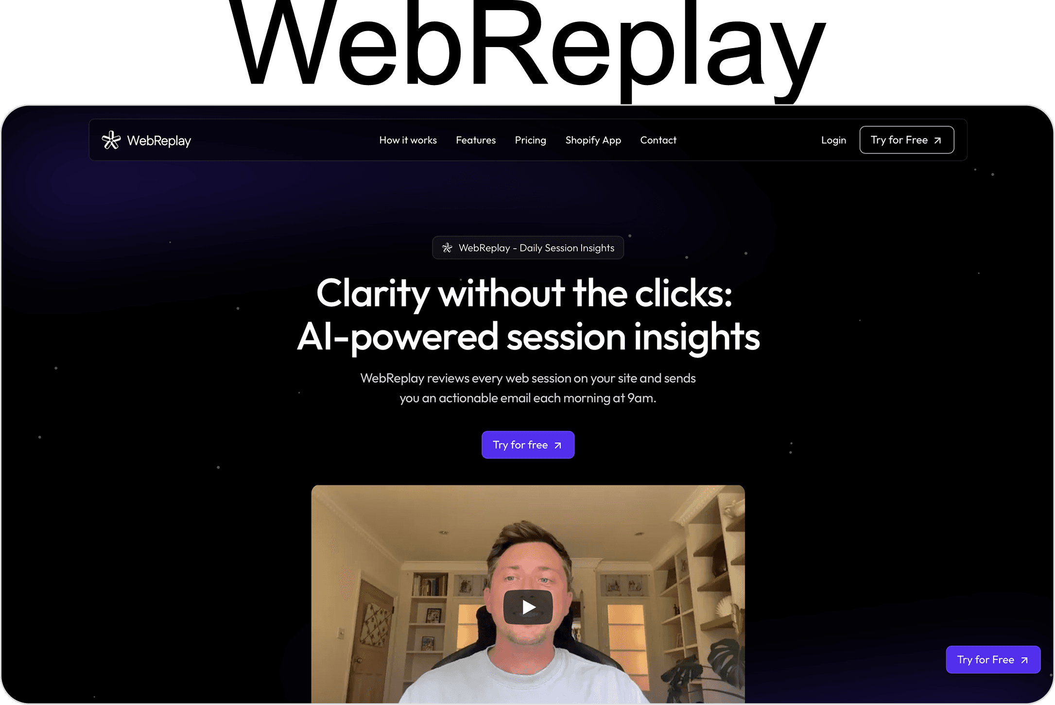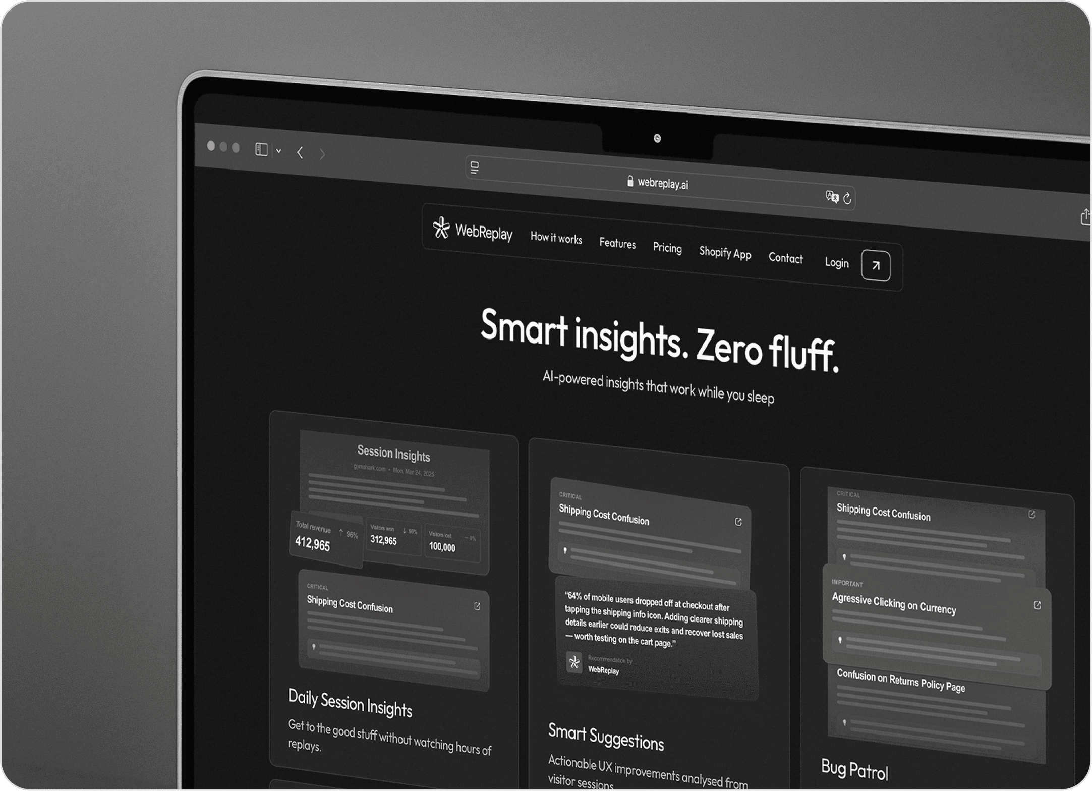 WebReplay is an AI-driven analytics platform that transforms raw user sessions into clear, actionable insights — without requiring you to watch a single replay. Once you add a single line of code to your site, WebReplay automatically records every session, analyzes user behavior overnight, and sends you a concise yet powerful report every morning at 9am.
